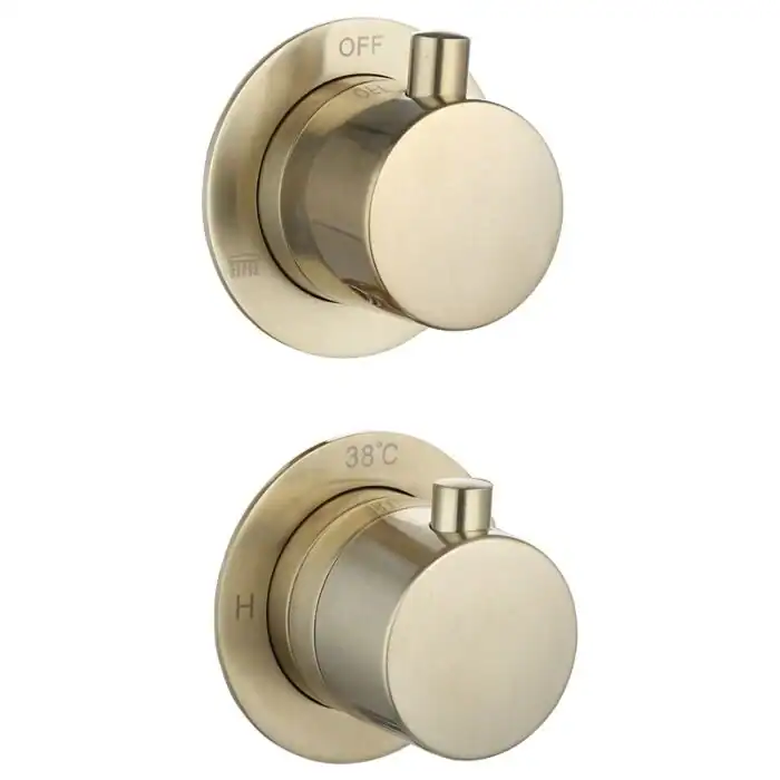 DOUCHESET INBOUW MET BOX THERMOSTAAT, MUURBEVESTIGING / AFWERKRINGEN / DOUCHEKOP 25 CM ROND GOUD GEBORSTELD